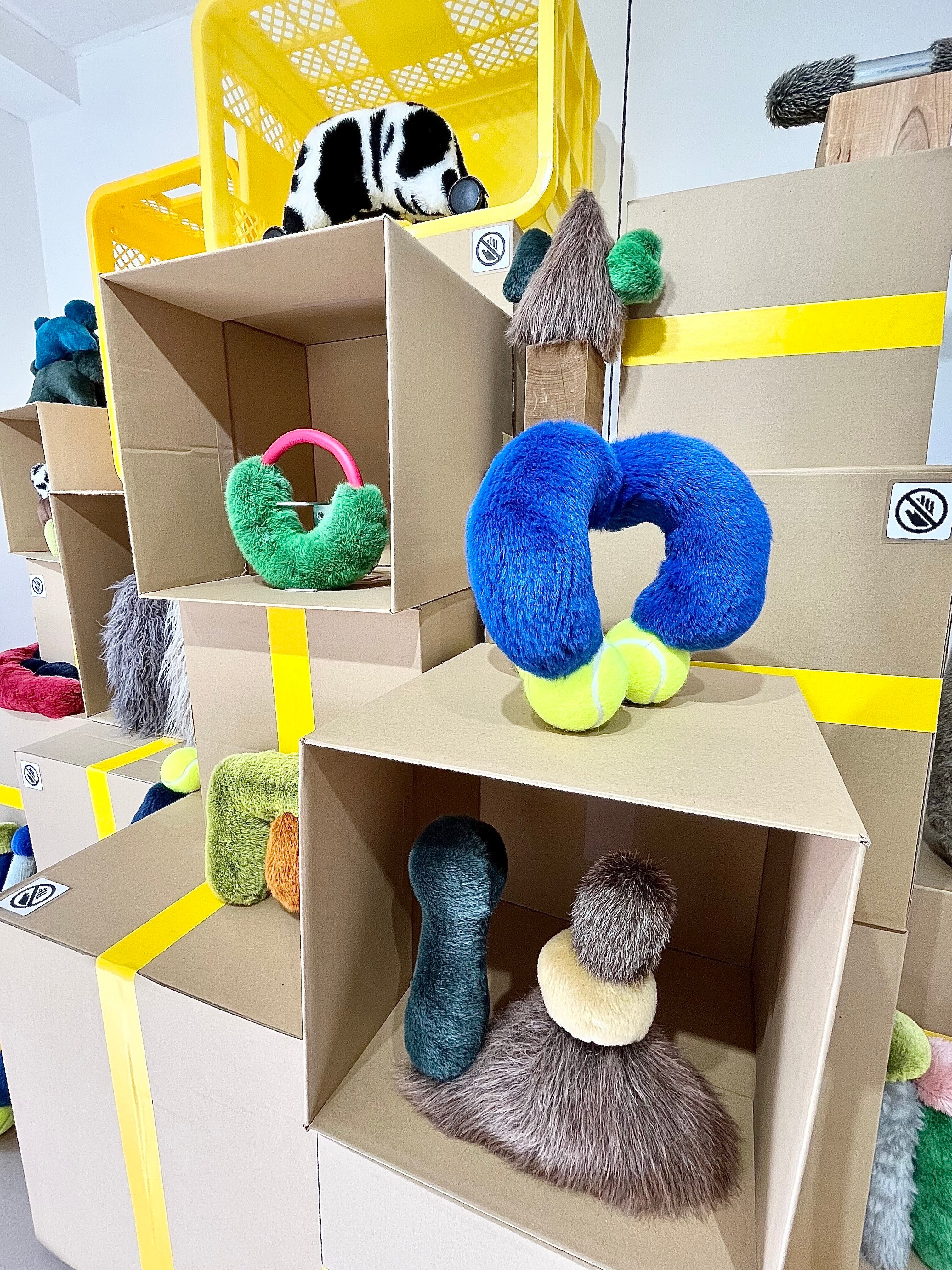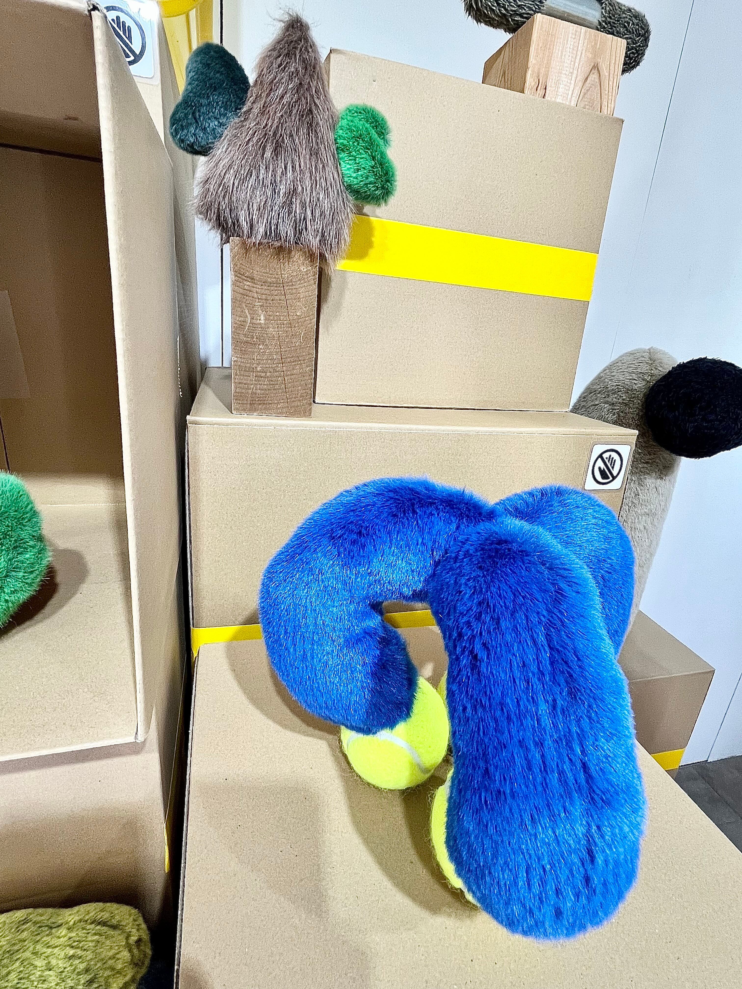 起毛生地や綿を用い、縫製技術を取り入れた立体作品を制作している。フェイクファーなどの起毛素材を多く用い、「人が残した痕跡」や「人との距離感」をテーマに制作を行っている。
