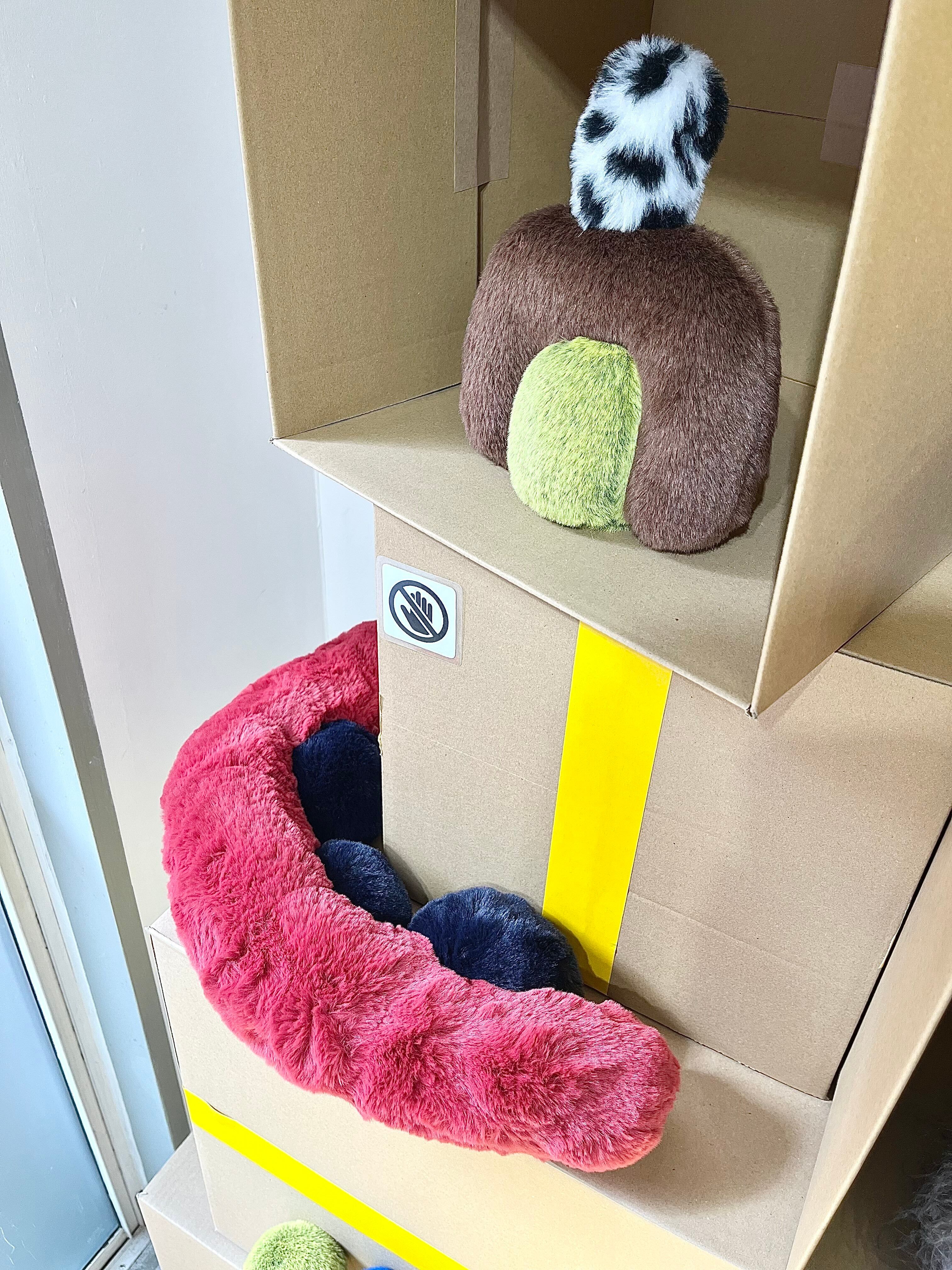 ふわふわとした質感や積み木のような造形から動物のような存在を連想する人もいれば、